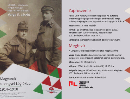 Serdecznie zapraszamy na prezentację najnowszej książki Endre Vargi.Szeretettel meghívjuk Önöket Varga Endre legújabb könyvének bemutatójára. Data/Időpont: 16 kwietnia 2026, godz. 17:00 – 2026. április 16., 17:00 óra Miejsce/Helyszín: Polski Dom Kultury – Lengyel Művelődési Ház – 1051 Budapest, Nádor utca…