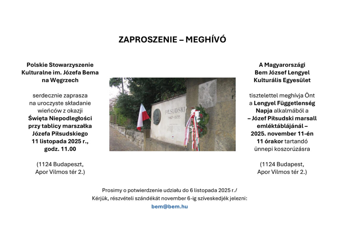 *Saját hozzájárulás: 1800 Ft/fő Befizetés az Egyesület székhelyén: november 7-8. 16 -18 h. vagy átutalással 2025. november 10-ig: Magyarországi Bem József Lengyel Kulturális Egyesület; HU39 1170 5008 2001 2759 0000 0000; Közlemény: támogatás