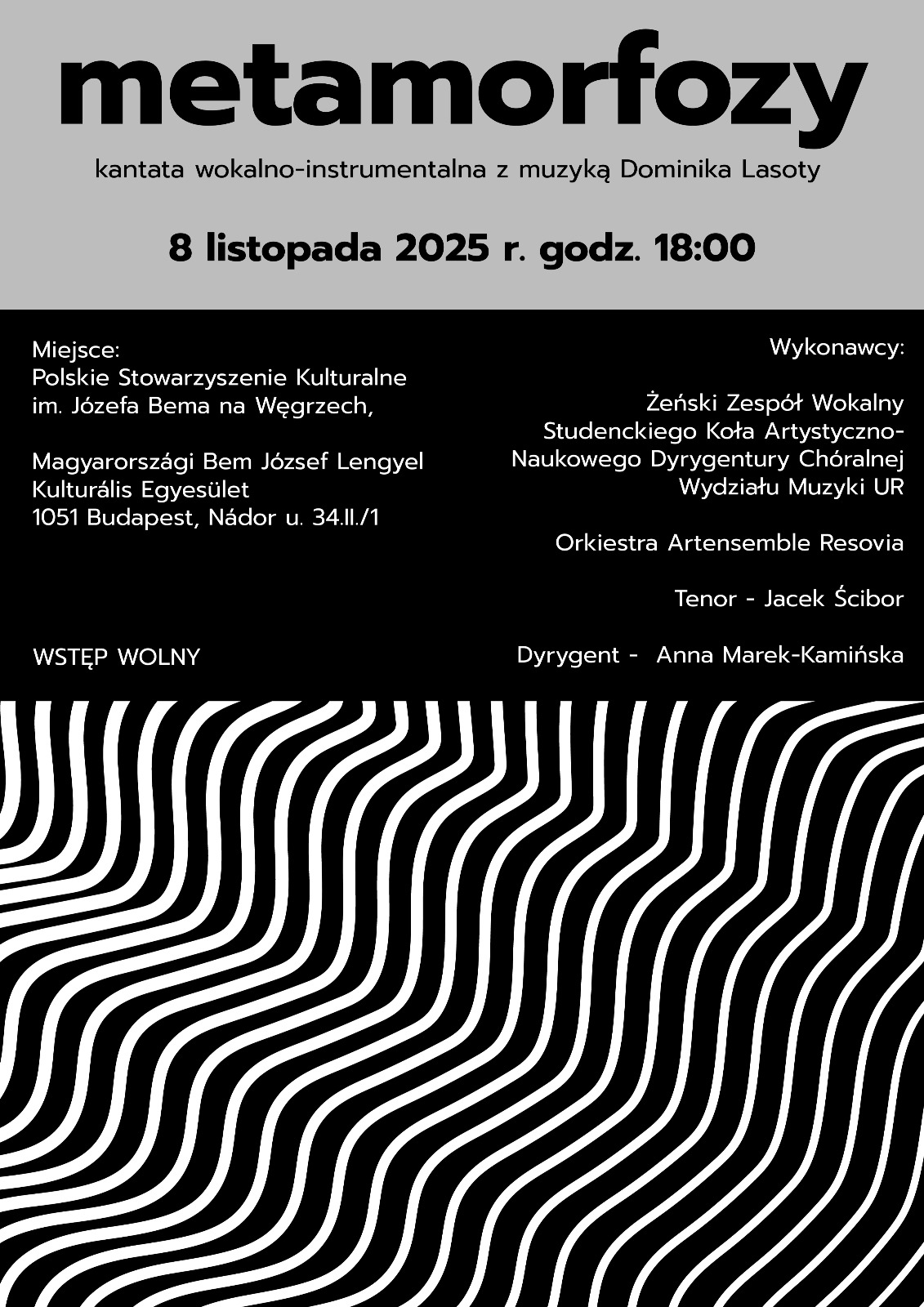 metamorfozy – kantata wokalno-instrumentalna z muzyką Dominika Lasoty 2025.10.28. Zapraszamy 8 listopada 2025 r. godz. 18:00 WSTĘP WOLNY (Prosimy o potwierdzenie udziału do 6 listopada 2025 r. na bem@bem.hu) Poprzedni Siedmiogrodzkie miejsca pamięci i historie związane z Polską - Erdélyi lengyel emlékhelyek, történetek Może Ci się spodobać Uroczystości przy Pomniku Ofiar Katyńskich 2022.04.13. Koncert fortepianowy Alexa Szilasi 2022.03.11. Wsparcie na pokrycie kosztów funkcjonowania organizacji 2024.12.30.