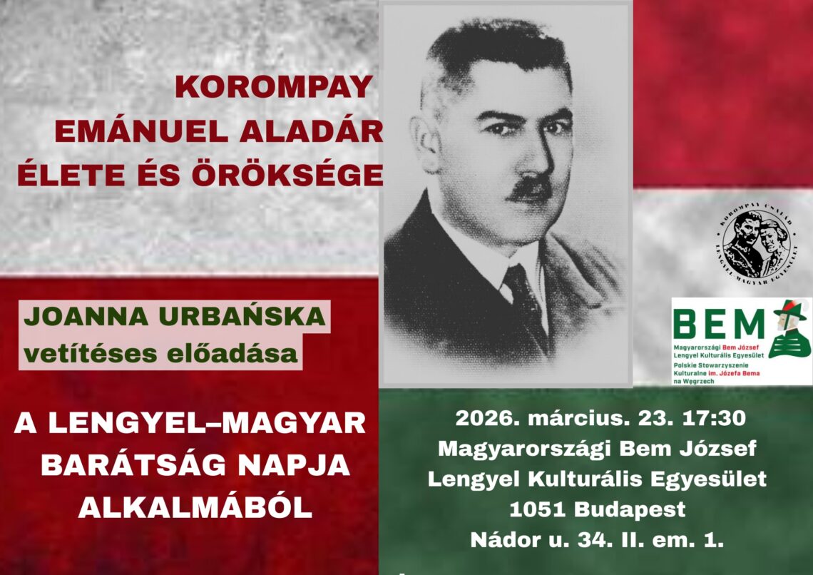 A lengyel–magyar barátság napján nagy szeretettel meghívunk minden kedves érdeklődőt Joanna Urbańska “Korompay Emánuel Aladár élete és öröksége” című vetítéses előadására, amely 2026. március 23-án (hétfőn) 17.30-kor kerül megrendezésre a Magyarországi Bem József Lengyel Kulturális Egyesület székhelyén (1051 Budapest, Nádor u. 34. II. em. 1).